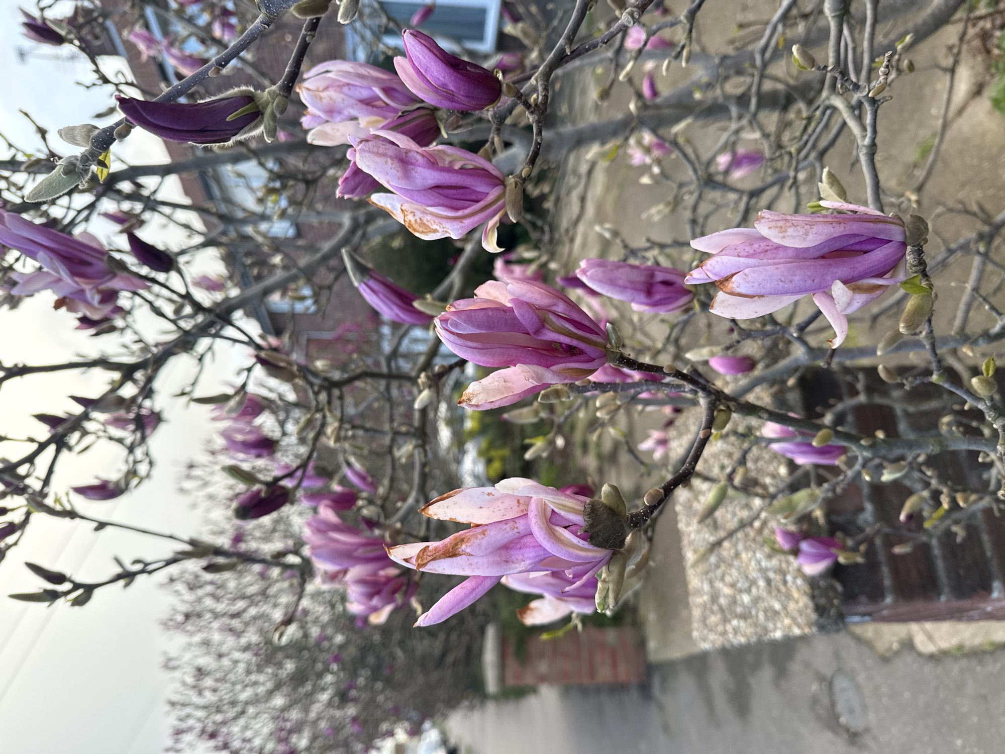 close-up view of a magnolia tree in bloom, with pink and purple flowers and buds emerging from bare branches. The tree is likely located in Gorleston-on-Sea, United Kingdom, given the context. The background includes a blurred residential area with glimpses of buildings, foliage, and a street. The angle is low, looking up at the branches. The image appears to be taken on an overcast day.