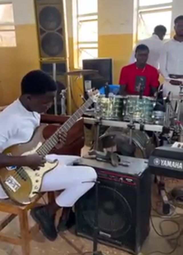 A band is playing music indoors. A man in white is playing a bass guitar, seated on a wooden chair. To the right, a man in a red shirt plays drums, and a woman in a yellow and white garment plays a Yamaha keyboard. Behind them, two other men in white shirts stand. Speakers and musical equipment surround the band, and light comes in through windows on the left and in the background. The overall scene has a casual, rehearsal-like quality.