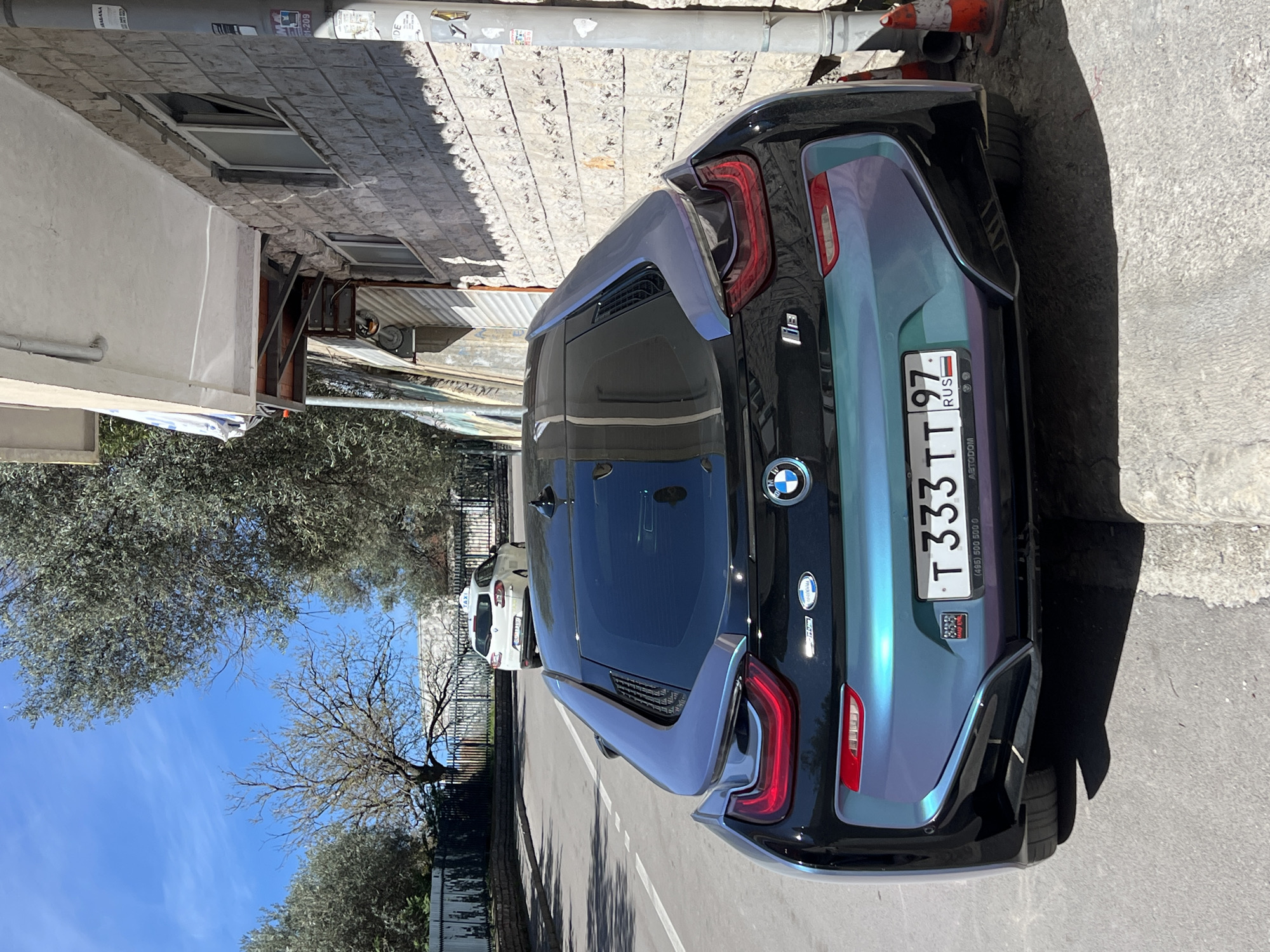 A BMW i8 sports car is parked on an asphalt street in Rafailovići, Montenegro. The car has a unique, color-shifting paint job in shades of blue, green, and black. Its Russian license plate reads "T333TT97". The vehicle is parked close to a building with a grey brick facade, windows, and a metal structure visible above. Beside the car, a road marker is standing on a sidewalk. Trees with sparse foliage are visible in the background under a clear blue sky. A white car is parked down the street.