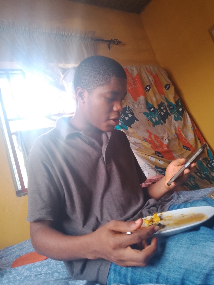 A young dark-skinned male with short dark hair, wearing a dark grey short-sleeved polo shirt and blue jeans, is seated indoors within a residential room in Mgbuoshimini, Nigeria