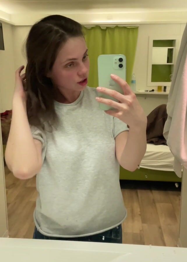 A young woman with light skin, wearing a light gray t-shirt and dark jeans, stands in a bathroom and takes a selfie with her light green Apple iPhone. She runs her right hand through her dark brown hair, which is partially pulled back. The bathroom features light-colored wooden floors, a white sink, a large mirror reflecting the room, and green curtains. A bed and a small wall shelf are also visible in the reflection. The lighting in the room is muted and even.