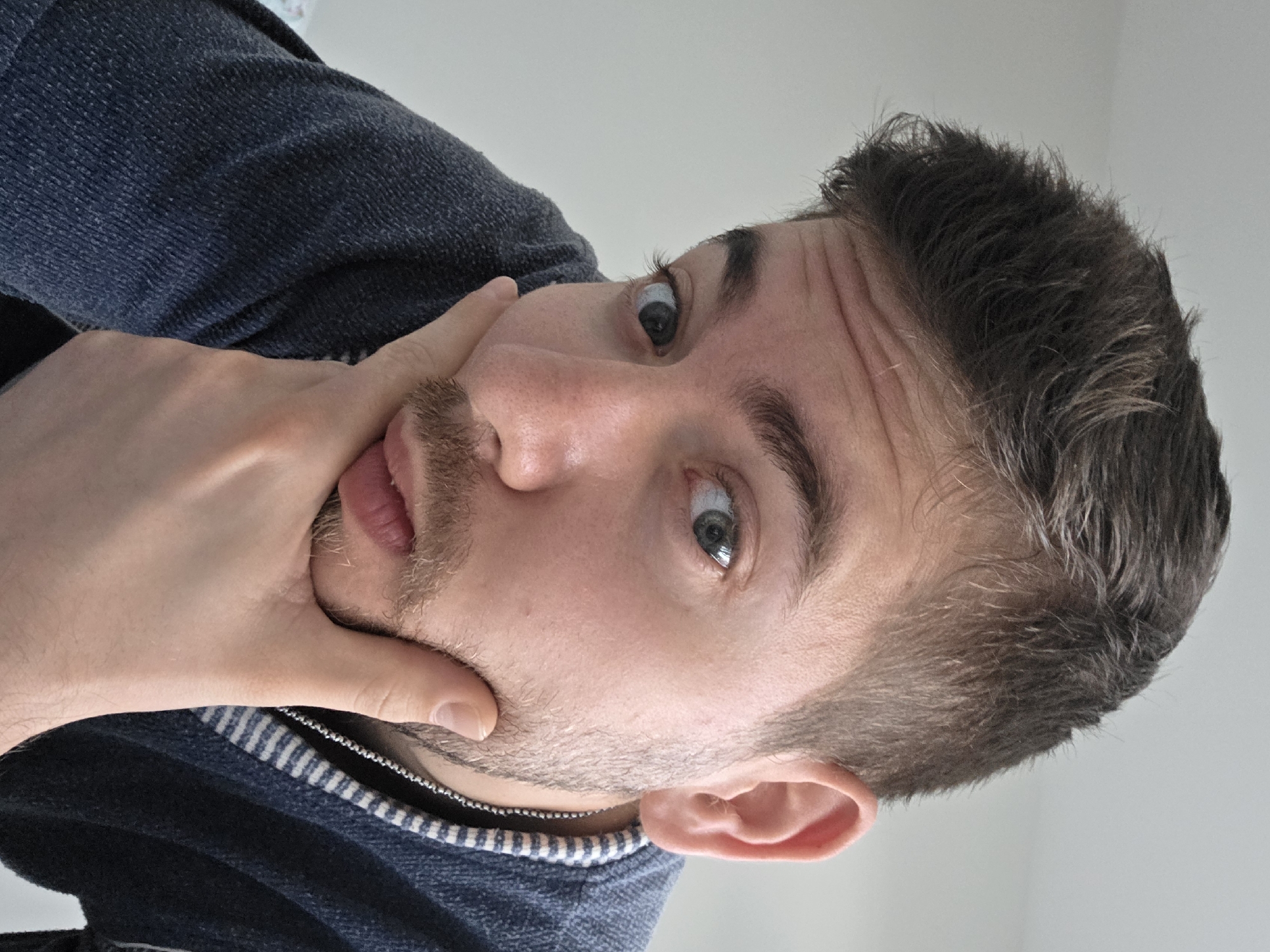 A medium close-up portrait of a fair-skinned man with brown hair and stubble is captured. He is wearing a blue denim shirt with a white striped neckline. His left hand is raised to his face, with his index finger touching his nose and his thumb resting on his chin. His expression appears thoughtful with wide eyes directed towards the upper left. The background is a plain, light gray color. There is no discernible evidence to suggest a location in Yagodovo, Bulgaria.
