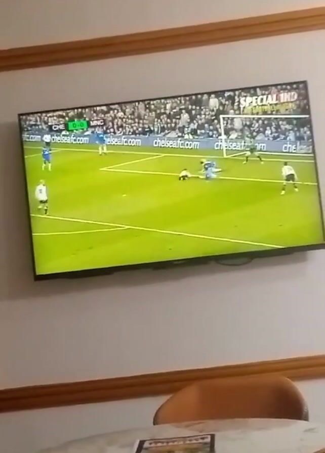 television playing a football match, displaying the score as Chelsea 0-0 MNC