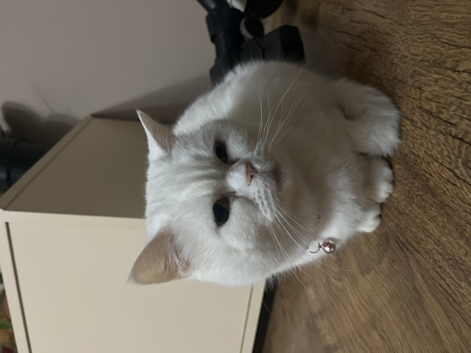 - "A domestic feline, exhibiting entirely white fur, is positioned centrally on a wooden plank floor within an interior space in Kovachevo, Bulgaria" by FM-HVVEG3, licensed under CC BY 4.0