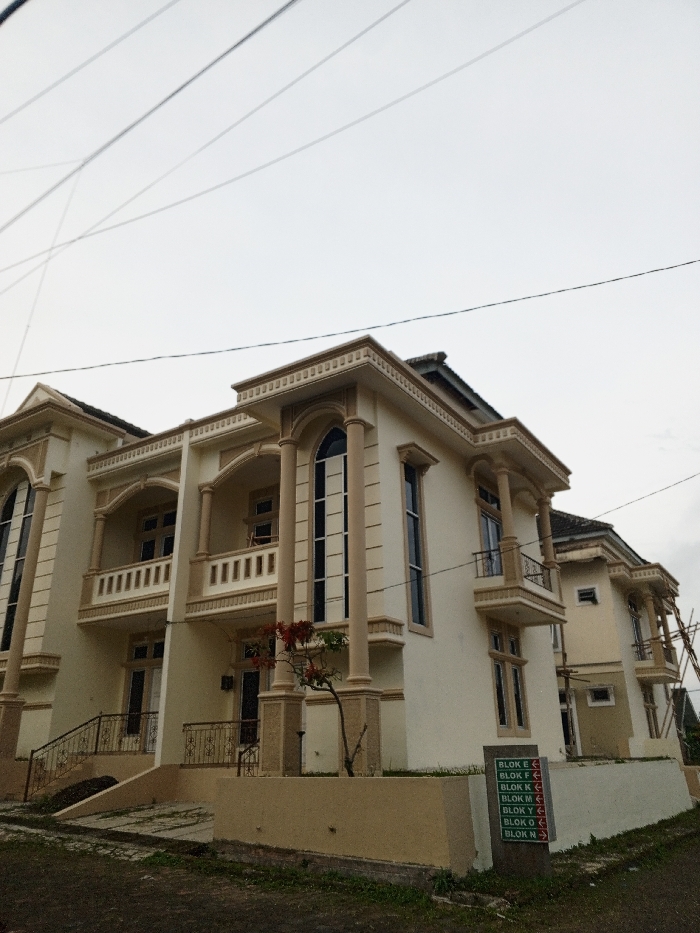 An upward-angled view captures a residential street in Batheay, Cambodia, under an overcast sky. The primary subjects are a series of multi-story houses, primarily colored in a light beige or cream with decorative darker accents around windows and rooflines. The architecture features classical elements, including fluted columns, ornate cornices, and arched windows. The foreground presents the facade of the nearest house, which is two stories. It has an elaborate front entrance with a short staircase featuring a wrought-iron railing leading to a raised platform and a dark-framed glass double door. Above this, a balcony with a similar railing extends across a portion of the second floor, flanked by large, arched windows. A small tree with sparse reddish foliage is planted in a raised planter in front of the house. To the right of the nearest house, additional residential structures extend into the background, exhibiting similar architectural styles. Some of these appear to be under construction or undergoing renovation, evidenced by visible scaffolding made of bamboo or timber. A prominent sign is visible on the right, displaying directional arrows next to capitalized text, including "BLOK E," "BLOK F," "BLOK K," "BLOK M," "BLOK Y," "BLOK O," and "BLOK N," indicating various sections or blocks of a development. The ground directly in front of the houses is a mix of dirt and sparse green vegetation, appearing uneven and possibly undeveloped. Overhead, several utility lines, likely electrical or communication cables, crisscross against the pale, featureless sky. No individuals or active interactions are visible in the scene.