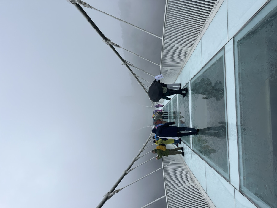 A group of people is walking on a glass bridge in foggy weather. The bridge has white railings and is supported by cables. Some people are holding umbrellas. The glass panels reflect the people and the sky. The fog obscures the view beyond the bridge. The scene is from a low angle, looking up at the bridge.