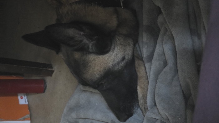 This image presents an indoor scene located in Magny-les-Hameaux, France. A sable-and-black canine, consistent with a Belgian Malinois or German Shepherd, is depicted lying on a crumpled grey blanket. The dog's head is turned left, with its dark muzzle and erect left ear prominent. Its front paws are tucked under its head, and a dark collar is visible around its neck. The background reveals a light-colored floor, where an orange cardboard item with a partial white label is positioned near a vertical dark red cylinder and a dark wooden furniture leg. The foreground shows blurred purple fabric. The scene is dimly lit, with shadows present.