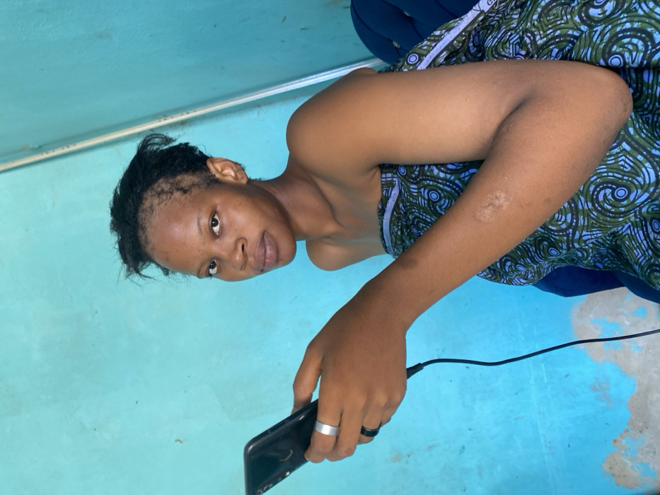 The image presents a young, dark-skinned woman situated indoors, observed from the chest up, looking directly at the camera with a neutral expression. Her short, dark hair shows areas of visible scalp, particularly along the sides of her head. She is draped in a patterned fabric, primarily blue and green with circular designs, covering her lower torso and partially her left shoulder, leaving her right shoulder and arm exposed. Several light-colored scars or marks are visible on her right forearm. In her left hand, she holds a black smartphone vertically, plugged into a black cable that extends downwards. She wears a silver-colored band on her left ring finger and a black band on her left middle finger. The background consists of a wall painted a faded turquoise-blue, exhibiting signs of wear and discolouration, especially near the bottom edge. A dark blue upholstered surface is partially visible behind her right shoulder. The scene is located in Minna, Nigeria.