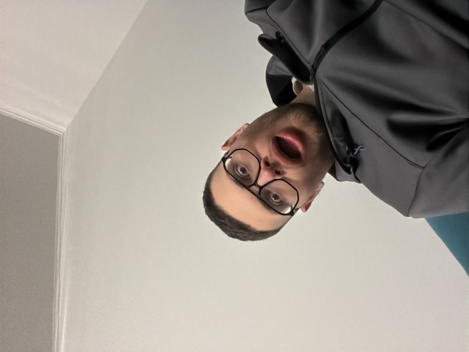 A male individual is depicted in a close-up, low-angle indoor portrait taken in Bansko, Bulgaria. He has short dark hair, a light beard, and wears black-framed eyeglasses and a dark gray zippered hooded sweatshirt. His head is tilted to the right, and he directly faces the camera with wide eyes and an open mouth, conveying an exaggerated expression. The background consists of a plain light-colored wall with white coving visible along the ceiling line. A segment of a blue-green object is present in the lower left corner of the frame.