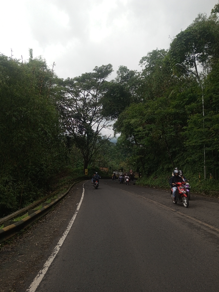 The image displays an asphalt road in Ariyalai East, Sri Lanka, bordered by dense green vegetation under an overcast sky. The road features a solid white line marking its left edge and gently curves towards the right in the distance. A yellow and grey metal guardrail runs along the left side of the road, beyond which is a lower bank and a thick growth of tall, slender green plants, consistent with bamboo. On the right side of the road, the terrain rises, covered in a dense forest of various green trees and bushes, with a street light pole visible further down the road. Multiple motorcycles are present, all traveling away from the viewer. In the right foreground, a red scooter is occupied by two helmeted individuals wearing dark clothing, with a purple scooter partially visible behind it. Further ahead, a dark-colored scooter with a single helmeted rider proceeds on the left side of the lane. Approximately five additional motorcycles, each with one or two helmeted riders, form a cluster in the mid-ground on the right. A large tree with a wide, full canopy stands prominently in the center-left mid-ground. Distant hills are faintly visible through the trees beneath the cloudy sky in the background.
