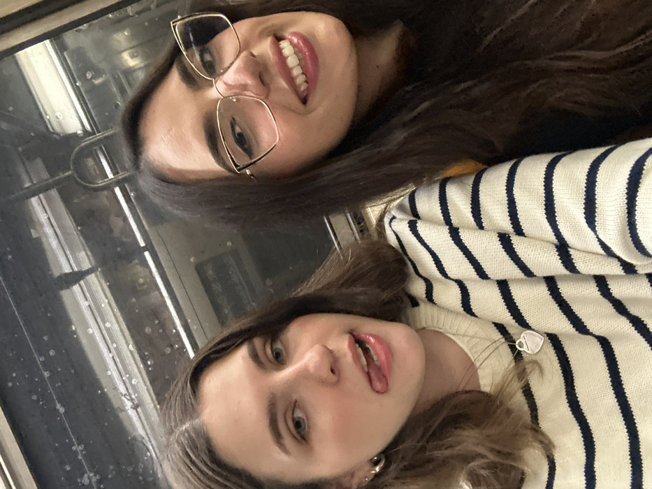 This image depicts two young adult females inside a New York City subway car, United States. The background features a dirty window or reflective surface, and overhead metal grab handles characteristic of public transit vehicles. The female on the left has medium brown hair and light-colored eyes. She is wearing a cream-colored sweater with horizontal dark blue stripes, a silver-toned heart-shaped pendant necklace, and a silver hoop earring in her left ear. Her mouth is open, and her tongue is extended in a playful gesture towards the camera. The female on the right has long dark brown hair and dark eyes. She is wearing gold-framed cat-eye eyeglasses and is smiling broadly, revealing her teeth, while also looking directly at the camera.