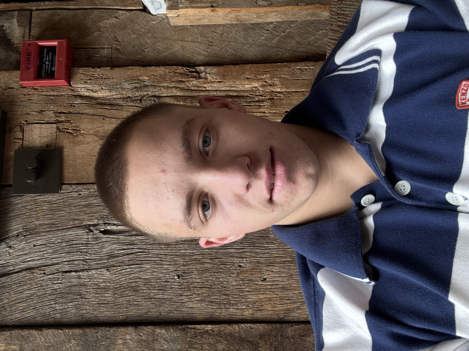 A young Caucasian male, approximately 18-25 years old, with short brown buzz-cut hair and blue eyes, is depicted from the chest up, centered in the frame