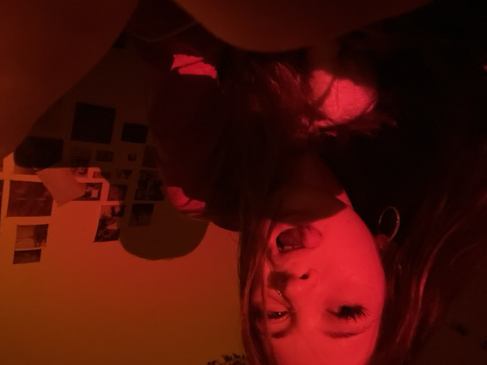 The image depicts an indoor scene intensely illuminated by red light, casting a predominant crimson hue across all visible elements. In the foreground, a female individual's head and upper torso are visible. She has long, dark hair, prominent eyelashes, and wears a hoop earring in her visible left ear. Her mouth is open, with her tongue partially extended. She is dressed in a dark-colored garment. Portions of her body, possibly an arm or leg, are visible in the lower foreground as dark, rounded forms. The background features a wall, appearing orange-red under the lighting, decorated with a dense collage of numerous small photographs or prints. A dark, indistinct silhouette of an object, possibly furniture, is visible against the wall behind the subject's left side. The individual is directly facing the camera in a posed manner. The specific location within the city of Raanana, Israel, cannot be determined from the visual evidence provided.