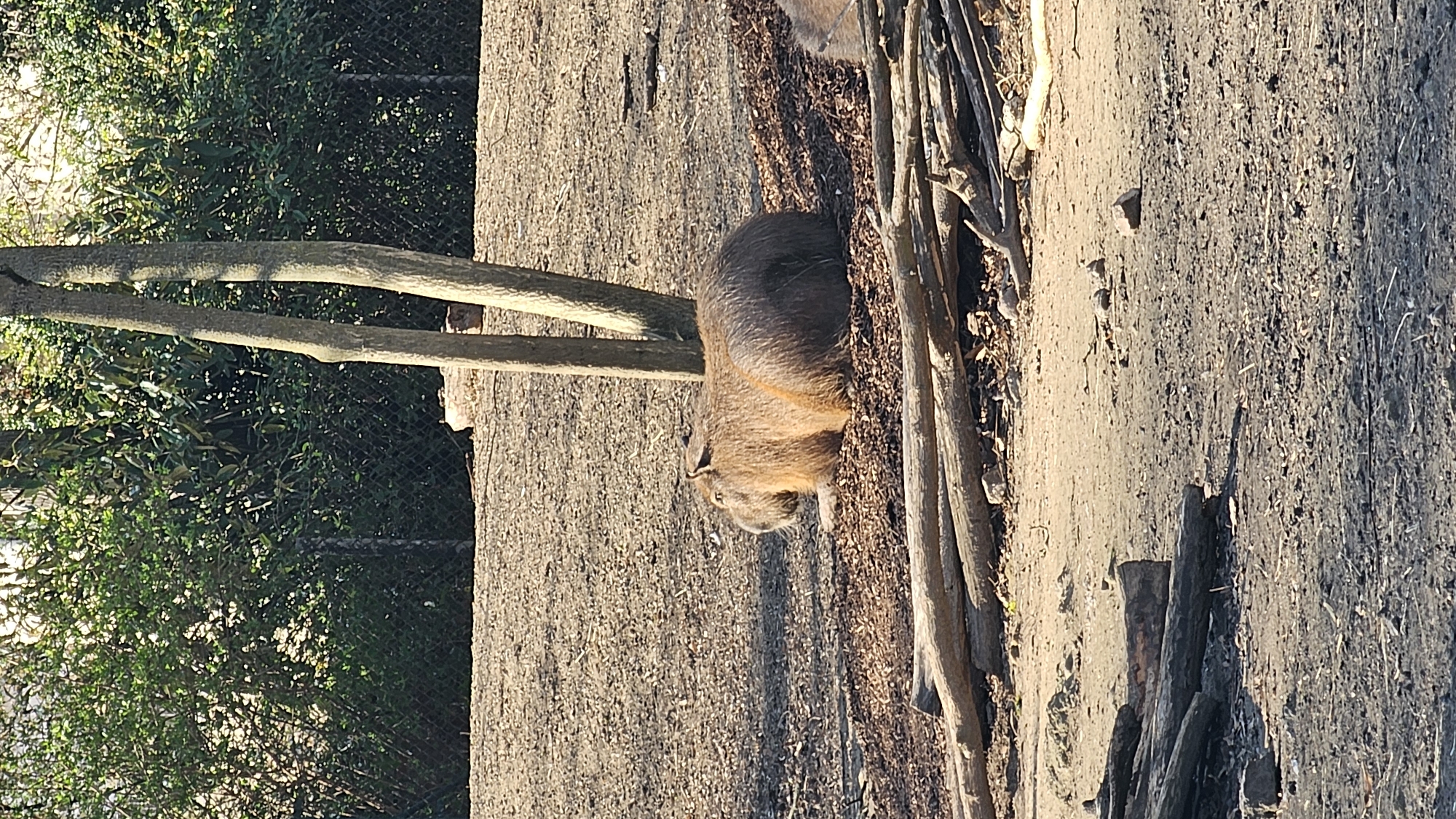 The image displays an outdoor enclosure within the Frankfurt Zoo (Zoologischer Garten Frankfurt am Main) in Frankfurt, Germany. The primary subject is an adult capybara (Hydrochoerus hydrochaeris) with coarse, reddish-brown fur, observed lying down on its stomach on a patch of dark soil or mulch. Its head is turned towards the left, with eyes appearing closed or downcast, suggesting a state of rest. A second capybara is partially visible on the far right. The ground consists of light brown, dry, compacted earth, scattered with dried leaves, twigs, and several fallen logs or branches of varying sizes in the foreground and midground. Two slender, light-barked tree trunks stand vertically behind the main capybara. In the background, a dark chain-link fence is visible, separating the animal enclosure from dense green foliage and additional trees. Direct sunlight illuminates the scene, casting soft shadows. No human presence or specific interactions are observed.