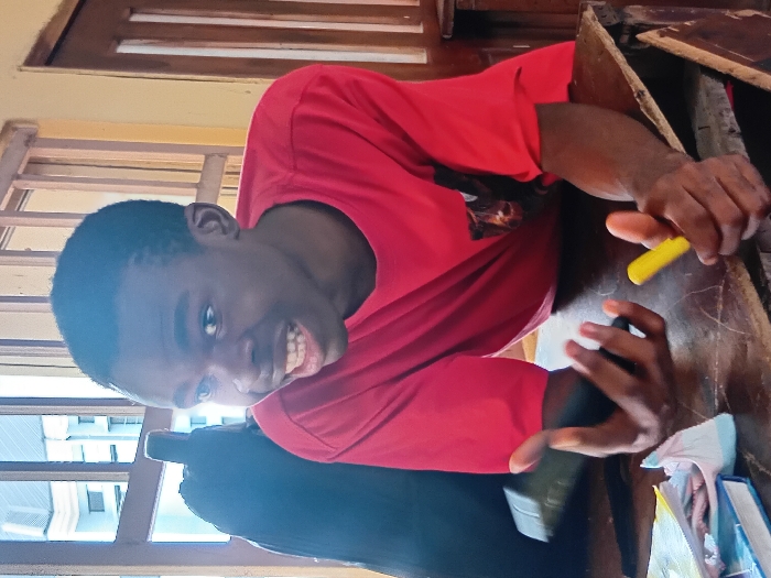 The scene takes place indoors in Ukukwa, Nigeria. A young male, with short dark hair and a red t-shirt, leans forward over a dark brown wooden desk, facing the viewer directly. His mouth is open, revealing teeth, and his eyes are wide. He holds a black rectangular electronic device in his left hand and a yellow cylindrical object in his right. On the desk to his left, a stack of books, including one with a blue cover, and a crumpled white object are visible. Behind him, a window with light-colored frames reveals the exterior of a light-colored multi-story building. A dark, vertical object stands near the window. To the subject's right, a brown wooden door with vertical panels is partially visible.