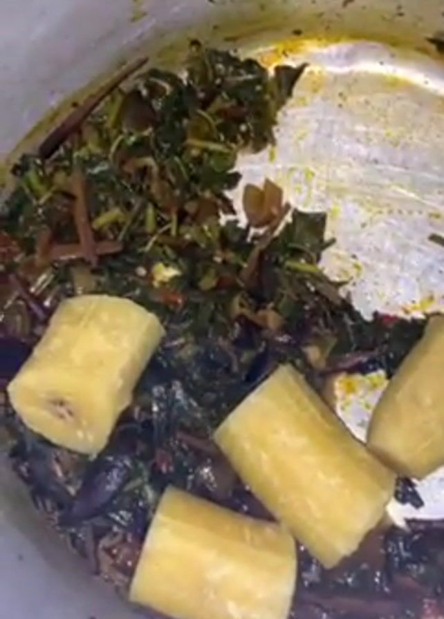 The inside of a metal cooking pot contains chopped green and brown vegetables with chunks of peeled yellow plantain. There is a residual oily substance on the bottom of the pot.