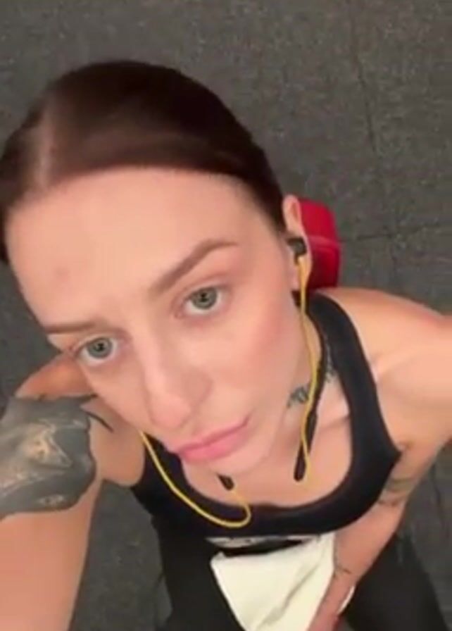 The video presents a close-up, high-angle shot of a woman with fair skin, brown hair pulled back, and light blue eyes. She's wearing a black sports bra and black leggings, with yellow earbuds around her neck. Visible tattoos adorn her shoulders and neck. She is holding a white towel in her hands. The background appears to be a gym floor with gray textured flooring and a red object visible behind her. The lighting seems to be artificial and somewhat bright. The woman's expression is neutral as she looks into the camera.