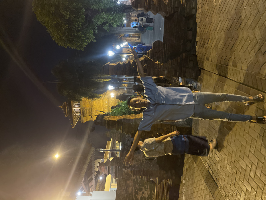 This nighttime image, captured in the city of Kauman, Indonesia, depicts a public area illuminated by artificial light. In the foreground, a young adult male stands centrally, facing the camera with a slight smile and both arms outstretched horizontally to his sides, palms open. He wears a light blue, short-sleeved collared shirt, light grey skinny jeans, and black open-toed sandals. To his left and slightly behind, another male figure is partially visible, facing away or sideways, wearing a light-colored patterned short-sleeved shirt and a dark blue sarong-like garment. The ground beneath them is paved with interlocking bricks in a herringbone pattern. The mid-ground features several weathered brown brick structures, resembling low walls or decorative architectural elements, separating the foreground from the background. In the background, on the left, a building with a traditional tiered, carved wooden roof structure is visible behind the brickwork. Prominently displayed in the center-right background is a tall, multi-tiered brick tower with intricate details and a distinctive Javanese-style roof, illuminated by warm yellow light. Palm trees and other leafy trees are visible behind and around these structures, particularly on the right side of the frame. Multiple streetlights emit bright, warm-white light throughout the scene, creating lens flares and illuminating other indistinct figures walking or congregating in the distance to the right. The overall environment is an urban or semi-urban setting, likely a cultural or historical precinct, under clear night skies.