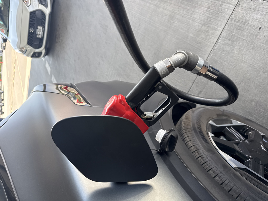 A gas pump nozzle is inserted into a car's fuel tank. The car, possibly gray or matte black, is being filled. The fuel cap dangles next to the fuel door. A tire is visible near the fuel tank area. In the background, partially visible, is another car, possibly white or silver. The setting appears to be a gas station.