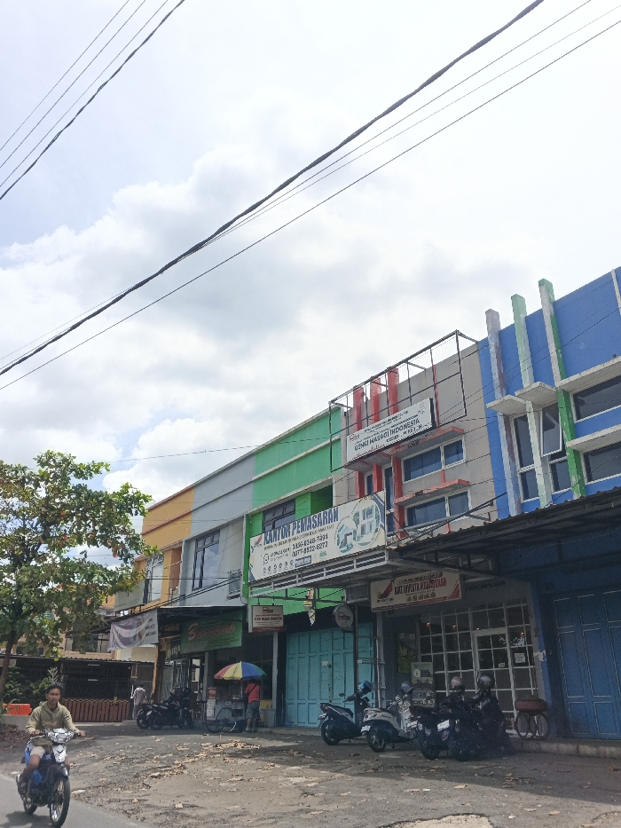 A view of a row of two-story commercial buildings painted in different colors: yellow, green, gray, and blue. Each unit has a storefront. Signs are visible, including "KANTOR PEMASARAN" and "GEMAH HASTGI INDONESIA." Several motorcycles are parked in front of the buildings. A man rides a scooter on the road in the foreground. Power lines cut across the sky.