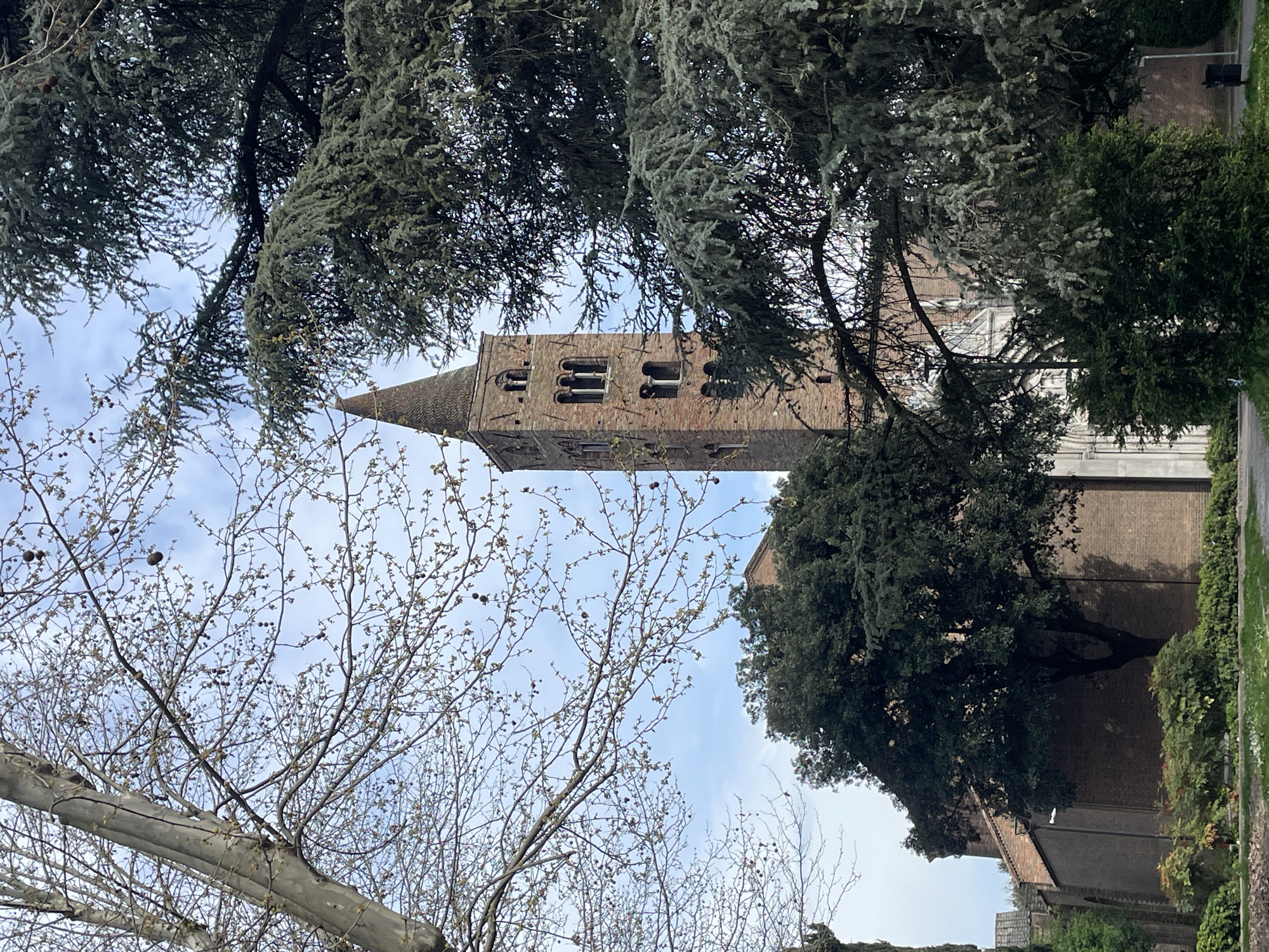 The image depicts the exterior of the Basilica di Sant' Apollinare Nuovo in Ravenna, Italy, as seen through a mix of tree branches. A brick bell tower is visible rising above the Basilica. The sky is visible through the branches of the trees. The Basilica has a red brick wall. The Bell Tower has an architectural style that is common to early Byzantine architecture.