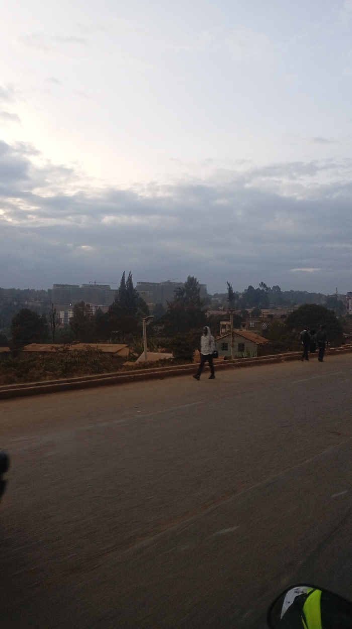 A cloudy sky hangs over a cityscape featuring buildings, trees, and a road. On the road, a person walks towards the left, while two other individuals stand on the right side. The foreground focuses on the paved road, showcasing its texture and markings. The horizon line is slightly obscured by the buildings. Overall, the scene evokes a sense of urban life under a gloomy sky.