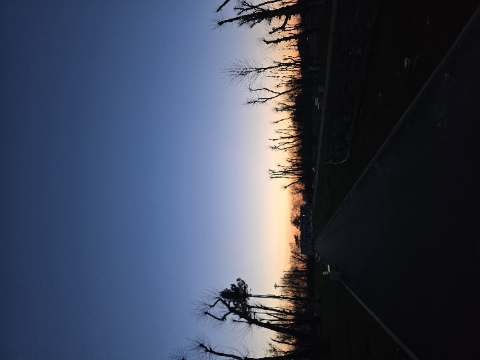 The image captures an outdoor scene at dusk within a park in the city of Levski, Bulgaria. The sky transitions from a deep blue at the top to an orange and yellow hue near the horizon. Numerous deciduous trees, appearing bare and pollarded, form dark silhouettes against the twilight backdrop. A dark, paved pathway, bordered by lighter curbs, extends from the foreground into the distance. Dark, unlit grassy areas flank the pathway on both sides. Several light-colored park benches are positioned along the path and in the adjacent green spaces. A tall, slender pole, possibly a streetlight, is visible on the left side in the mid-ground. Distant, dimly lit structures, consistent with buildings, are discernible on the horizon toward the center-left. No human figures or active subjects are present in the depicted environment.