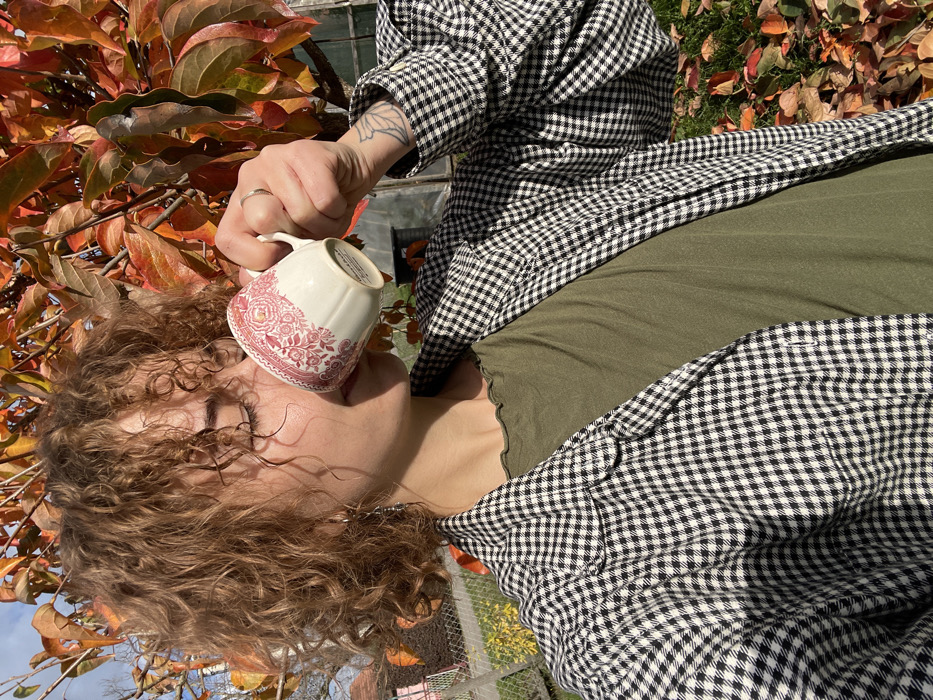 An outdoor, sunlit scene in Danilovgrad, Montenegro, depicts a person from the chest up, facing right with eyes closed, drinking from a cup. The individual has light brown, curly hair and wears an olive-green top with a ruffled neckline underneath an open black-and-white gingham plaid long-sleeved shirt. A silver-colored earring is visible in the left ear. The person holds a cream-colored ceramic cup with a red floral pattern and ridged texture to their lips with their right hand. A thin, plain ring is present on the ring finger of the right hand, and a stylized wing or feather tattoo is visible on the inner right forearm. The background features a tree with vibrant autumn foliage (reds, oranges, browns) directly behind the person, with scattered fallen leaves on the ground. A fence and portions of distant residential structures, one with a reddish roof, are visible to the left under a clear blue sky.