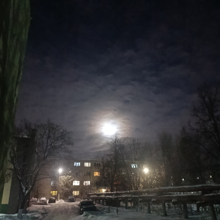 A nighttime winter scene under a cloudy sky with a bright moon. A snow-covered street is framed by bare trees and apartment buildings with lit windows. Several cars are parked along the street. The foreground features snow-covered pipes or railings. A tall building obscures the left side of the image.