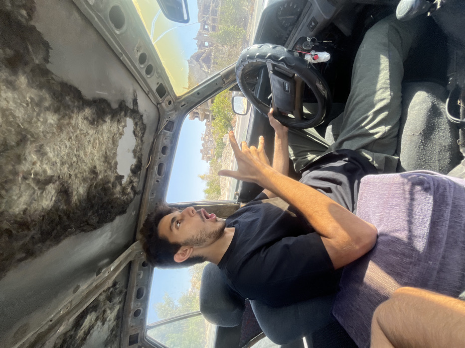 Inside a significantly damaged vehicle, a young adult male with dark hair and a beard sits in the driver's seat, in Joubar Municipality, Syria. He wears a black t-shirt and olive green pants, looking towards the camera with an open-mouthed expression of surprise and his right hand performing a gesture with the thumb, index, and pinky fingers extended. His left hand rests on a steering wheel, partially obscured by a black cover, which displays a "CORSA" logo. Keys with a white tag and a red charm are suspended from the ignition. The car's ceiling is heavily deteriorated, exposing fibrous insulation and structural elements. The windshield is cracked and has a yellowish tint. A purple cushion rests to the driver's left. Outside the vehicle, under a clear blue sky, a paved road and green foliage lead to a cluster of severely damaged, multi-story buildings in the background, indicative of extensive conflict-related destruction. The scene is brightly illuminated by daylight.