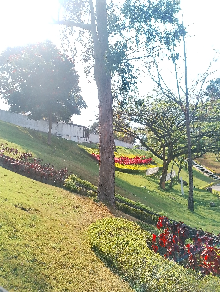 The image displays a brightly lit, landscaped park located in Caracas, Venezuela, specifically consistent with Parque del Este. The foreground comprises a sunlit green grassy slope containing low-growing red-foliage shrubs and a rounded green bush. A large tree trunk with textured brown bark dominates the right side of the frame, extending vertically beyond the top edge. In the midground, a higher grassy slope features a horizontal bed of red and yellow flowers arranged in distinct bands. A section of a white concrete retaining wall or barrier runs along the upper part of this slope. The background reveals additional green hills and several trees, with a set of light-colored outdoor stairs ascending a distant slope on the far right. The sky is largely obscured by bright sunlight, generating significant lens flare in the upper left quadrant. No individuals, animals, or active events are present in the scene. The environment is static, characterized by manicured vegetation and architectural landscaping elements under clear weather conditions.