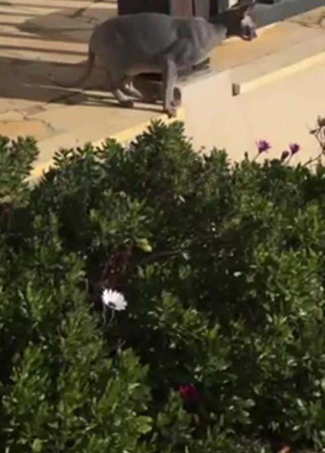 A gray cat is on a concrete porch near a wooden railing. The cat is near the edge of the porch and is looking down at a bush below. The bush is green and has a few small white and purple flowers on it. The sun is shining and the porch is well-lit.