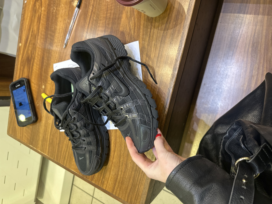 The image displays an indoor retail scene on a wooden table, situated in Tunbridge Wells, United Kingdom. A pair of black Nike P-6000 sneakers is centrally positioned, with a person's left hand, featuring red nail polish, holding the front portion of one shoe. The individual is wearing a black leather jacket, visible in the lower left foreground. Ancillary items on the wooden table include a black-cased smartphone with its screen illuminated, displaying what appears to be a web page or application. A clear ballpoint pen lies to the right of the sneakers, and a yellow highlighter is partially visible behind the left shoe. A light-colored disposable cup is present on the far right. A white piece of paper is visible beneath the sneakers. In the background, a beige or light-colored shelving unit or furniture item is discernible.