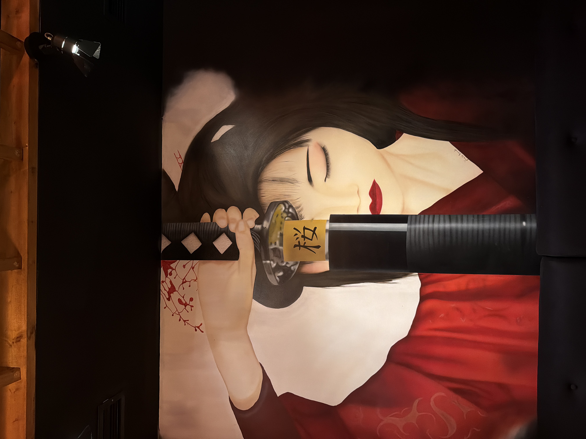 The image presents a large mural or painting covering the central portion of a wall within an interior space in Tirana, Albania. The painting depicts an upward-facing view of a Japanese-style woman, shown from approximately the mid-torso upwards, with her eyes closed and lips painted vibrant red. She has dark hair, styled in an updo, and wears a red garment, possibly a kimono, detailed with subtle patterns. Her right hand is positioned above her head, grasping the hilt of a katana (Japanese sword). A yellow label or tag with the Japanese character "桜" (sakura) is affixed to the blade or hilt of the sword. The background behind the woman is an off-white color with red, stylized cherry blossom branches on the left side of the painting, transitioning to a solid black on the right side. Above the painted wall, a dark, likely black, wall section is visible, topped by a ceiling featuring exposed wooden beams. A black track light fixture with two adjustable spotlights is mounted on the upper right, angled downward to illuminate the scene. A dark ventilation grate is present on the upper left wall section. Below the painting, a dark, likely leather or fabric, sofa or bench with visible tufting details extends horizontally across the frame. A vertical, black, cylindrical object with ribbed texture is positioned on the right side, partially obscuring the lower right portion of the mural and resting on the sofa.
