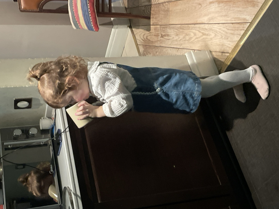 The image displays an indoor scene, likely a kitchen or dining area, located in Khimki, Russia. A young child with light reddish-brown curly hair, styled in a high ponytail, stands facing right. The child wears a white, textured long-sleeved shirt, a blue denim overall dress, white tights, and light pink socks. The child is holding a light-colored mug with both hands to their mouth, actively drinking. To the child's left, a silver-colored microwave oven rests on a light-colored countertop. The microwave's reflective door clearly displays a mirror image of the child drinking from the mug. A white mug and a dark-colored smartphone with a cable are also present on the countertop. Dark brown wooden cabinets are situated beneath the countertop. An electrical outlet is mounted on the light grey wall behind the counter. To the child's right, a wooden chair with a brown upholstered back is partially visible, featuring a striped cushion with horizontal bands of red, blue, yellow, and white. The floor consists of a dark grey or black textured surface in the immediate foreground, transitioning to a light brown wood-effect laminate or tile, separated by a thin gold-colored strip. Shadows are cast on the dark flooring by the child and nearby objects.