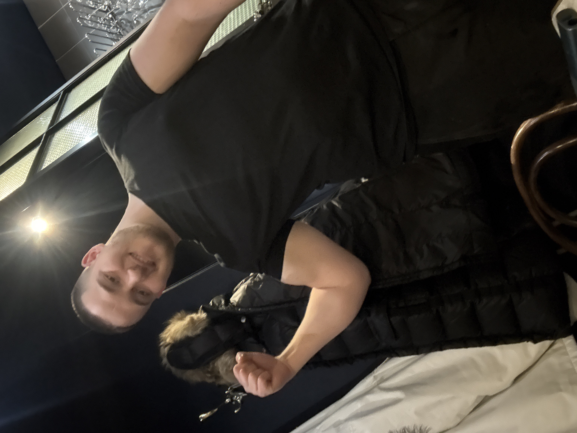 A man wearing a black t-shirt is taking a selfie indoors. A puffy black jacket with fur trim is draped over a white surface. The location could potentially be Sofia, Bulgaria, but there are no defining characteristics visible to confirm this.