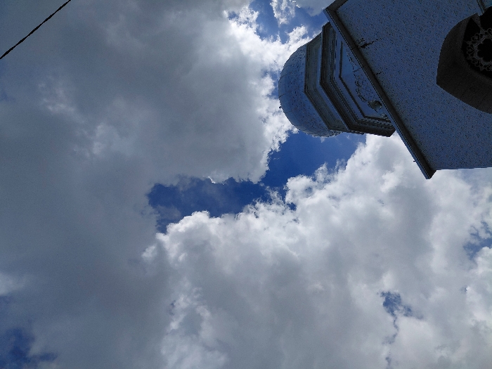 A worm's-eye view captures a portion of a light-colored building against a backdrop of a cloudy sky. The building, positioned at the upper right, features a domed structure. Fluffy white and gray clouds dominate the scene, interspersed with patches of blue sky. A thin, dark wire runs diagonally across the upper left corner. The composition emphasizes the height and scale of the building in relation to the vastness of the sky.