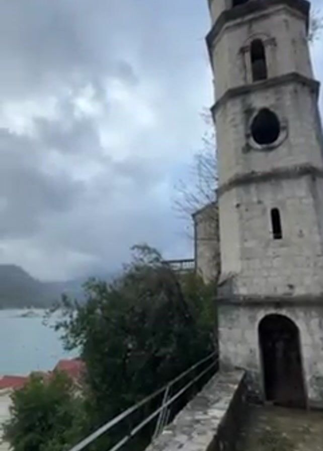 stone bell tower next to a ledge. Beyond the tower is an overcast view of a waterway surrounded by a town with red-tiled roofs. In the distance, mountains are covered in clouds.