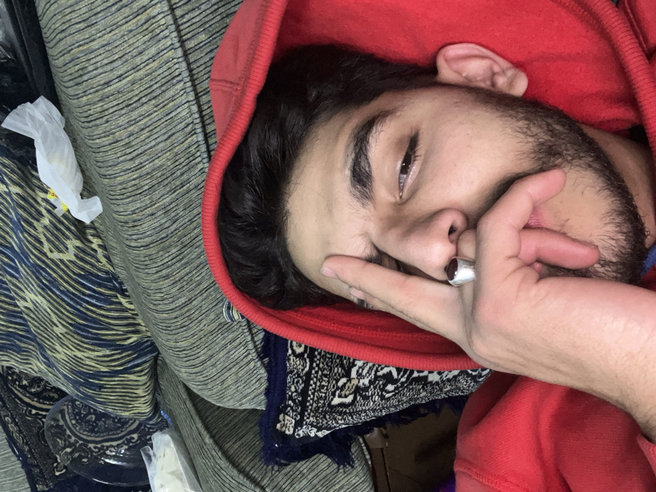 A person rests on a couch wearing a red hoodie. Their left eye is partially covered by their hand, where they wear a silver ring on their little finger. The couch has layers of patterned fabric, including a blue and yellow design on top of a textured gray layer, along with a patterned rug in shades of dark blue and black. A white plastic bag is partially visible near the couch’s edge. The person has a beard and dark hair.