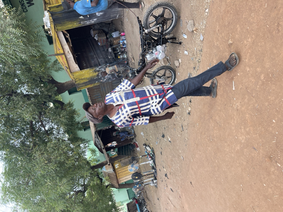 An older man in a checkered shirt, cap, and dark pants stands next to a partially disassembled motorcycle. He is on a dirt ground near a building with a yellow facade. Another person is seen working on something in the background. Trees are visible in the foreground and to the side. Several fans are on stands nearby.