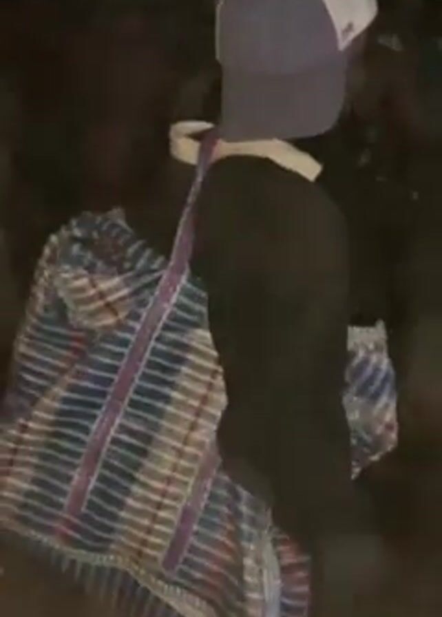 The video appears to have been taken at night. There are several people visible, and it is dark. A person wearing a baseball cap and a large colorful bag is in the foreground. Other individuals are seen further back, including one with a white cloth draped over them. There may be music playing.