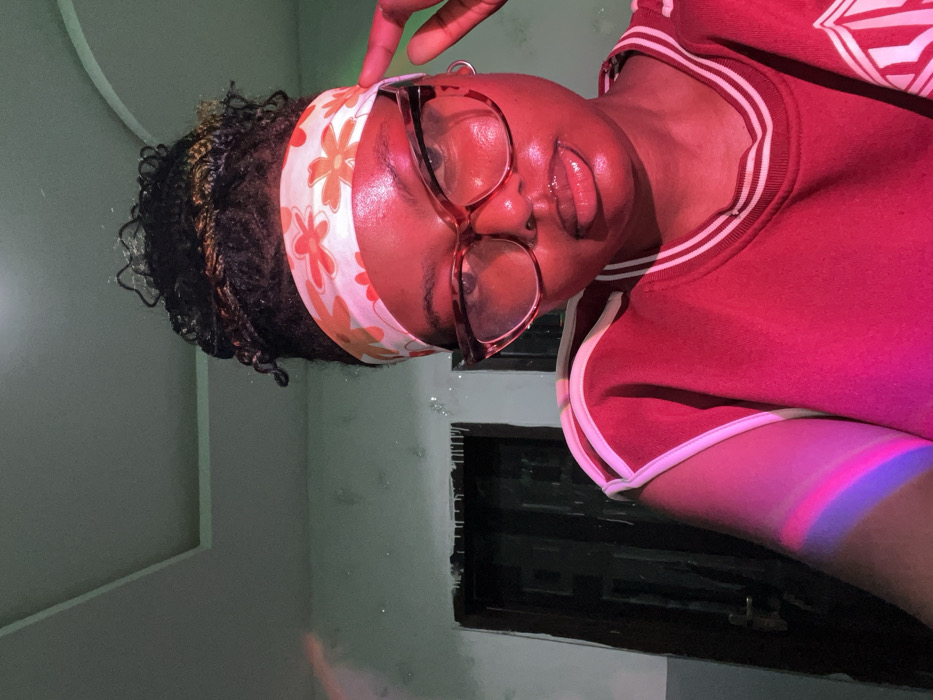 A person wearing glasses and a floral headband, clad in a red shirt with white trim, poses in a room. The person's skin is illuminated in a bright red light. The person is tilting their head. The background includes a section of wall and a window covered with glittery drops. A colorful light beam shines on the person's arm.
