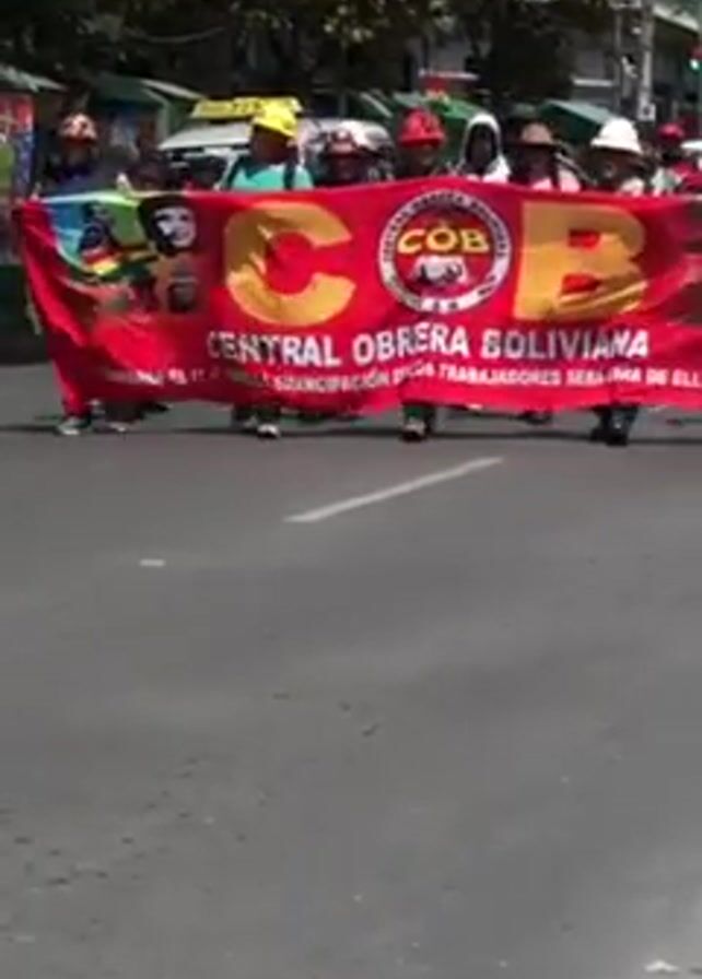 A group of people is marching down a paved street. They are carrying a large red banner with the letters "COB" in large yellow letters. Below the letters, the banner reads "CENTRAL OBRERA BOLIVIANA." The banner also has images of several figures on it. Most of the people are wearing hard hats and casual clothing. Some of the marchers are wearing hoodies. Trees and buildings line the street in the background. A person in a red hoodie and gray hat walks in front of the banner. The weather appears to be sunny.