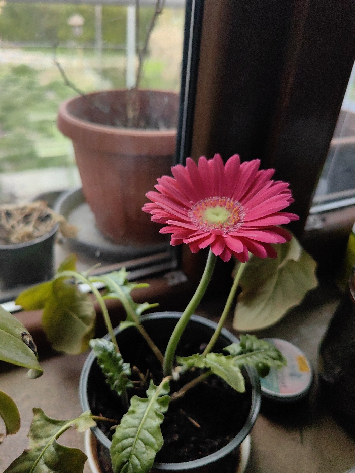 The scene is observed within a residence in Saedinenie, Bulgaria, specifically on an indoor window sill. The primary subject is a vibrant pink Gerbera daisy, centered and in sharp focus, displaying numerous petals and a yellow-green central disc, situated in a black plastic pot. The flower extends upwards on a single green stem. Surrounding the Gerbera pot on the brown-colored window sill are other potted plants; to the immediate left, a plant with broader, light-green leaves, some showing signs of wilting. Further left, a smaller black pot contains dry, fibrous material. To the right of the Gerbera pot, a small, circular container with a multi-colored lid (featuring pink, green, and yellow elements) is partially visible. Through a window in the background, a large, terracotta-colored pot containing a leafless plant or small tree is visible, slightly out of focus. Beyond this, a blurred outdoor environment shows green foliage and natural light conditions. A dark window frame delineates the indoor space from the outdoor view. To the far right, a section of dark brown interior wall or furniture is evident. No human subjects are present.