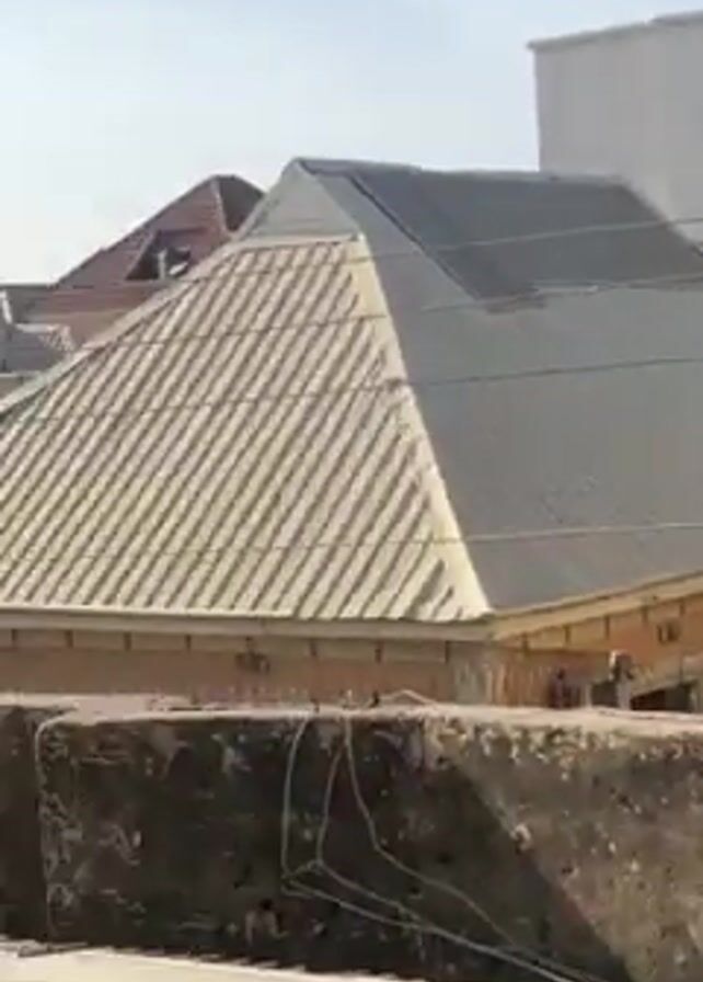 The camera pans across a neighborhood, showing various rooftops and buildings. The houses have a mix of flat and pitched roofs, some covered with corrugated metal sheets. Electrical wires stretch across the sky, and there are lush green trees interspersed between the buildings. The final shot is through a narrow opening, possibly a doorway or window, with a blurry view of more greenery outside. The overall impression is of a sunny day in a residential area.