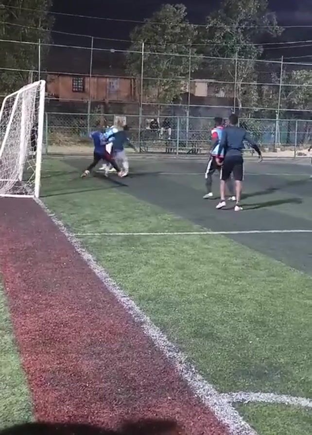 group of people playing soccer on a green artificial turf field at night. There are six people on the field, wearing different colored jerseys and shorts. The field is enclosed by a fence, and there are trees visible in the background. The lighting is provided by overhead lights. The camera is positioned near one of the goals, and the person filming is partially visible in the bottom left corner. The players are actively moving around the field, passing the ball, and attempting to score a goal.