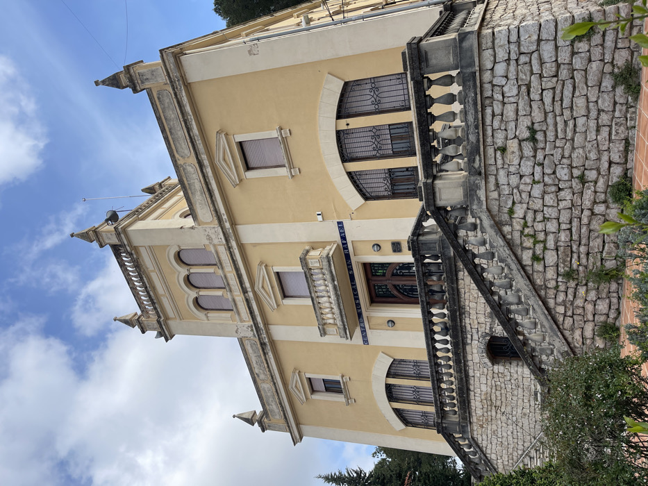 The image depicts the Centro Musical San Rafael, located in the city of Buñol, Spain. The building is a multi-story structure with a pale yellow facade and white architectural trim, set against a partially cloudy blue sky. It features an eclectic or neoclassical architectural style with decorative elements. The main entrance is positioned centrally on the second level, accessible via a broad, symmetrical stone staircase with balustrades. The staircase is built on a rough-hewn stone retaining wall. Above the entrance, a blue sign with white lettering reads "CENTRO MUSICAL SAN RAFAEL." Directly above this sign and the entrance, a small balcony with a white balustrade protrudes from the facade. The entrance itself consists of ornate dark wood double doors. Windows on the lower and upper levels vary in shape, including rectangular and arched designs. Most windows are fitted with closed internal blinds and some, particularly on the lower level, are protected by decorative black iron grilles. The building features white pilasters and cornices, and a prominent central tower-like projection above the main section of the roofline. This projection contains three arched windows with closed blinds. The roofline is adorned with multiple pointed finials or pinnacles, and a small satellite dish and an antenna mast are visible on the roof. To the left of the building, a mature pine tree is visible, extending above the roofline. In the foreground, at the base of the stone staircase and retaining wall, there are landscaped garden beds with green bushes and low-growing vegetation. A terracotta-colored tiled pathway or ground surface is visible at the very bottom of the frame. No individuals are present in the scene. Two small white security cameras are mounted on the facade near the main entrance.