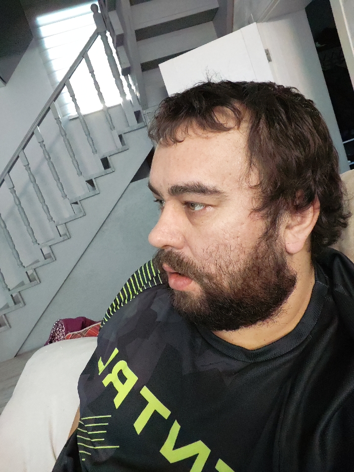 A male individual is depicted in a close-up, profile shot, facing left within an indoor setting in a city of Unknown, Unknown. He possesses medium complexion, dark brown wavy hair with a receding hairline, a full dark brown beard, and light-colored eyes. His mouth is slightly ajar. He wears a black short-sleeved shirt with a round neck, featuring neon green inverted partial text on the torso and a dark camouflage pattern with neon green vertical stripes on the left shoulder. The background reveals a light grey staircase with a banister, ascending towards the upper left. A bright light source is visible at the top of the staircase. A white, possibly cabinet or door, surface is visible on the upper right side of the frame. The individual appears to be seated or leaning on a light-colored cushion in the foreground, with a dark red patterned fabric object partially visible behind his left shoulder.