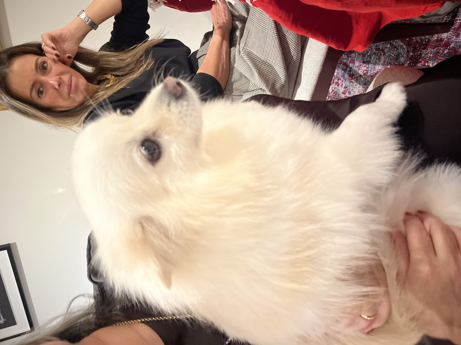 A white fluffy dog sits in someone's lap, its head tilted up, gazing upwards. A woman with long brown hair, wearing a black top, is in the background. She is looking at the camera, her hand near her face. There's a plaid patterned textile and some red fabric visible. A black-framed picture hangs on the wall in the lower left corner. The lighting is warm and indoor.