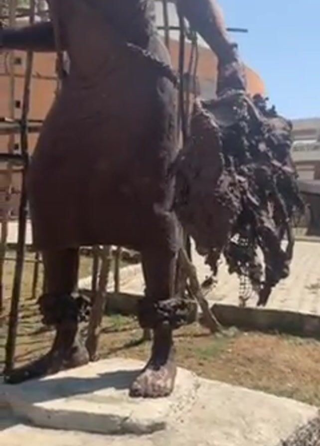 The camera pans around a brown sculpture of a person. The statue is of a woman, and she is holding what appears to be a stick in one hand and another large object in the other hand. She is wearing a dress and has anklets on. The statue is surrounded by scaffolding. In the background, there is a green lawn and a beige building. It is a sunny day.
